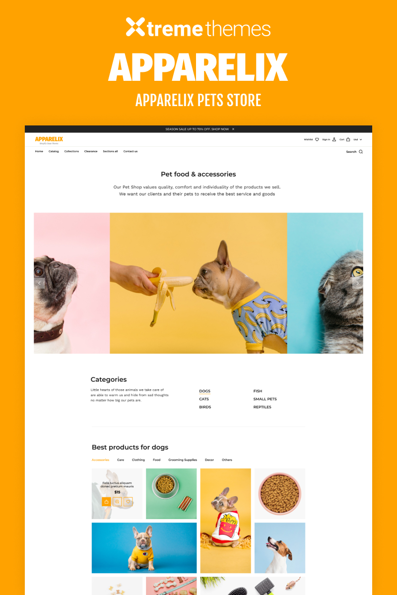 Shopify шаблон для интернет-магазина - Dog - Apparelix Pets Online Store Template Shopify Theme, идеально подходит для сайтов в категории Собаки.