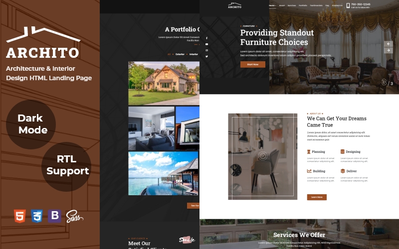 Archito - хорошо подойдет для сайтов Архитектура. Лендинг шаблон для одностраничного сайта - Architecture and Interior Design HTML Landing Page Template.