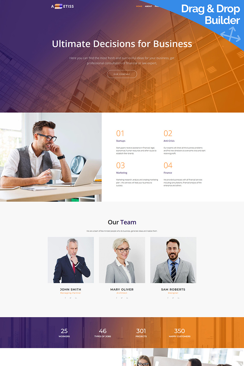 Assetiss - отлично подходит для сайтов в области Бизнес услуги. Moto CMS 3 отличный шаблон - Business Advisor Moto CMS 3 Template.
