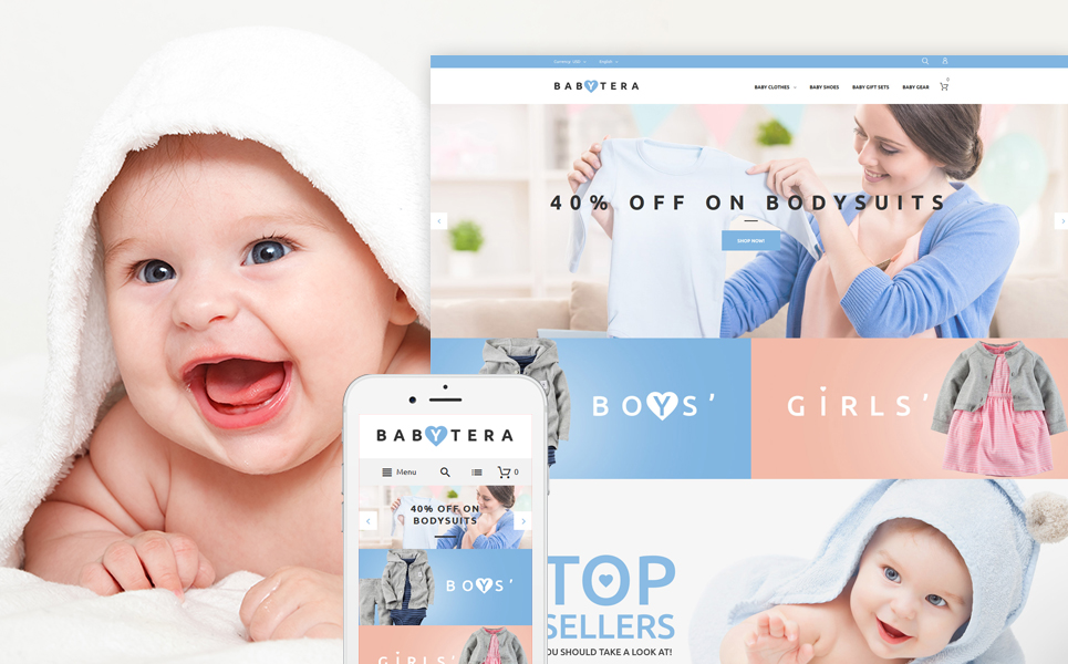 Magento минималистичный шаблон - Babytera - Baby Store Magento Theme, хорошо подходит для сайтов в категории Новорожденные.