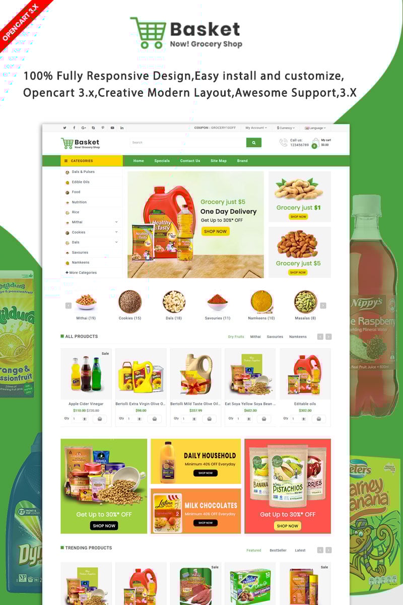Grocery Store - идеально подходит для сайтов в сфере Продуктовый магазин. OpenCart шаблон для интернет-магазина - Basket Grocery OpenCart Template.