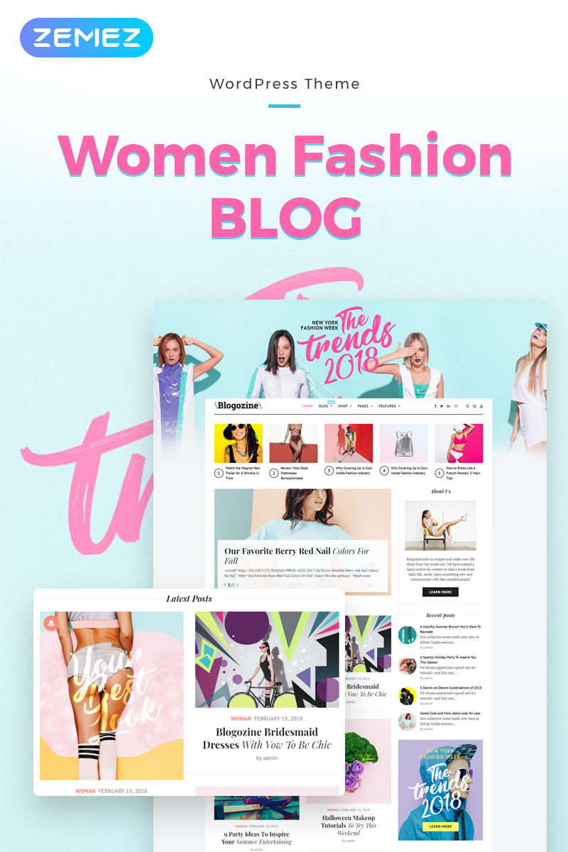 Blogozine - подойдет для сайтов в области Блог о моде. WordPress шаблон - Fashion WordPress Elementor Theme.
