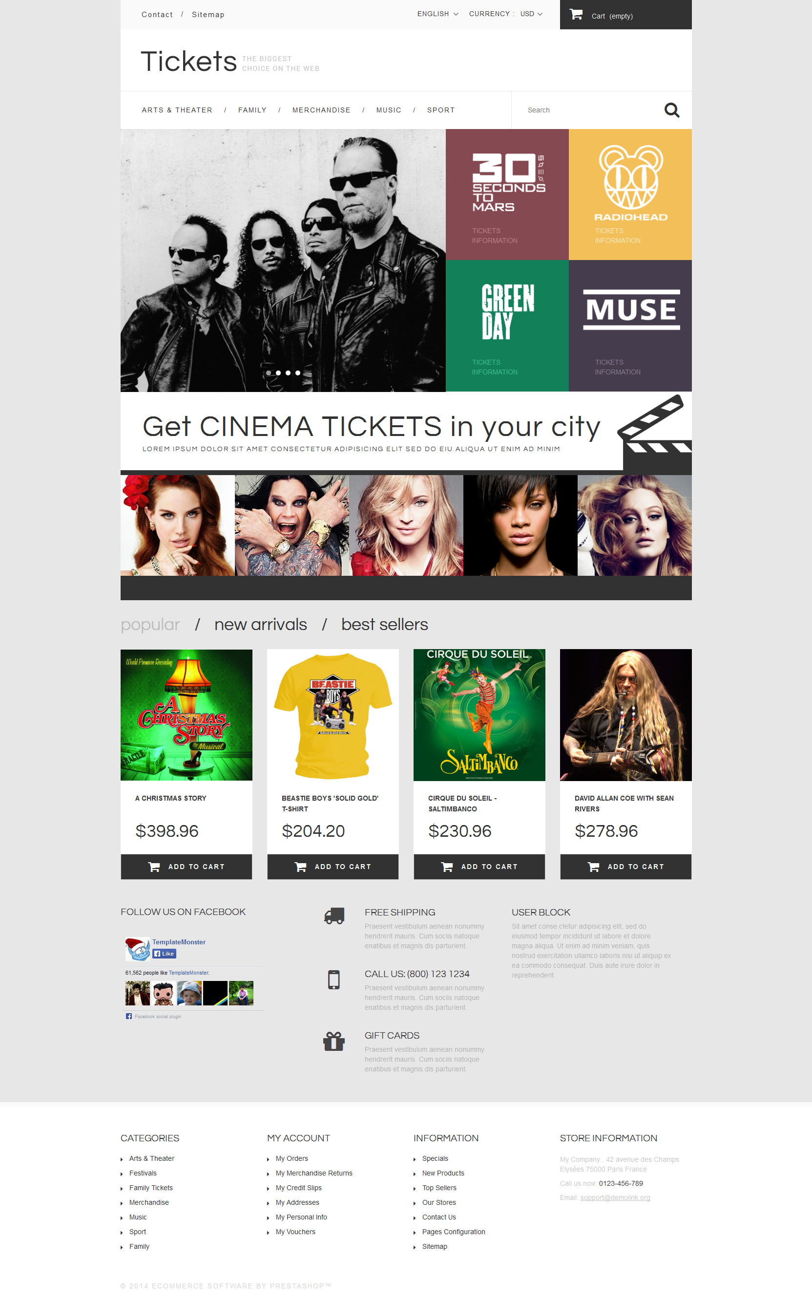 PrestaShop шаблон для интернет-магазина - Tickets Website - Book Tickets PrestaShop Theme, превосходно подойдет для сайтов в категории Покупка билетов.