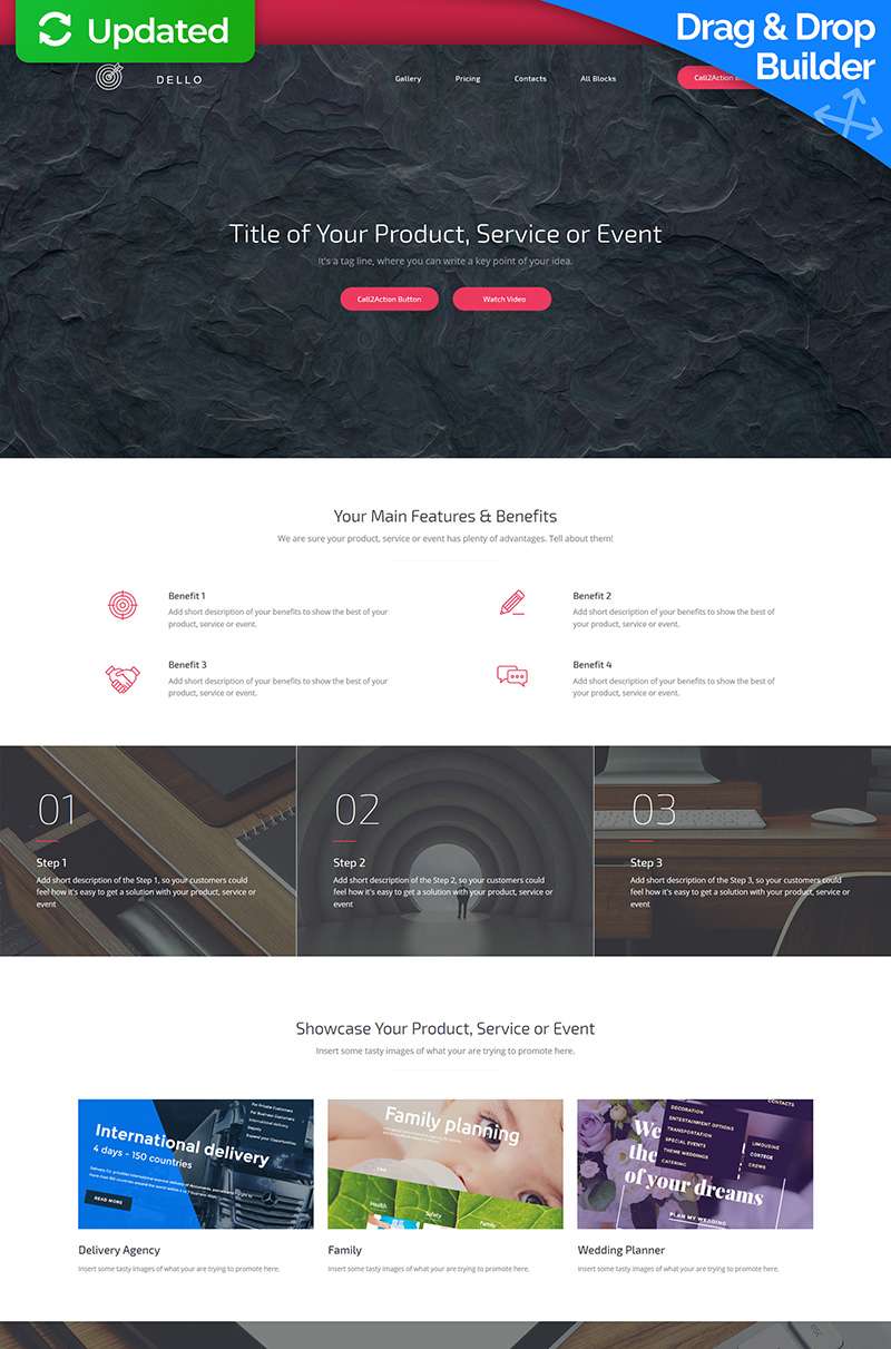 Хороший многофункциональный масштабируемый шаблон-лендинг для компании. Из коробки есть практически все разделы, какие только могут понадобится + адаптивная верстка с эффектом параллакса. Все выглядит солидно и без лишних эффектов. К MotoCMS, которой управляется контент, надо привыкать. Она организована по принципу WYSIWYG, поэтому тем, кто привык к html-коду по началу будет непривычно, затем пообвыкнешься и вполне можно работать. Рекомендуется для тех, кто только начинает свое дело и сайт нужен здесь и сейчас, и к тому же, красиво.