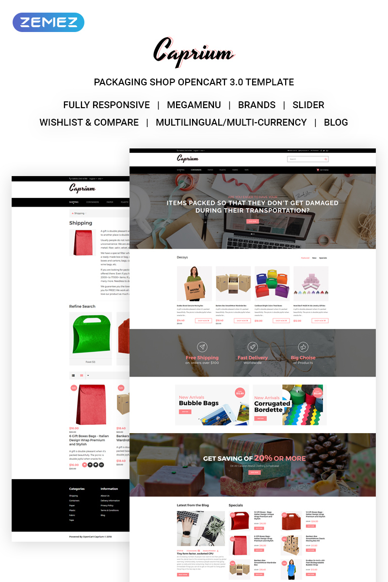OpenCart шаблон интернет-магазина - Caprium - Packaging Shop OpenCart Template, идеально подходит для сайтов на тему Упаковочные материалы.