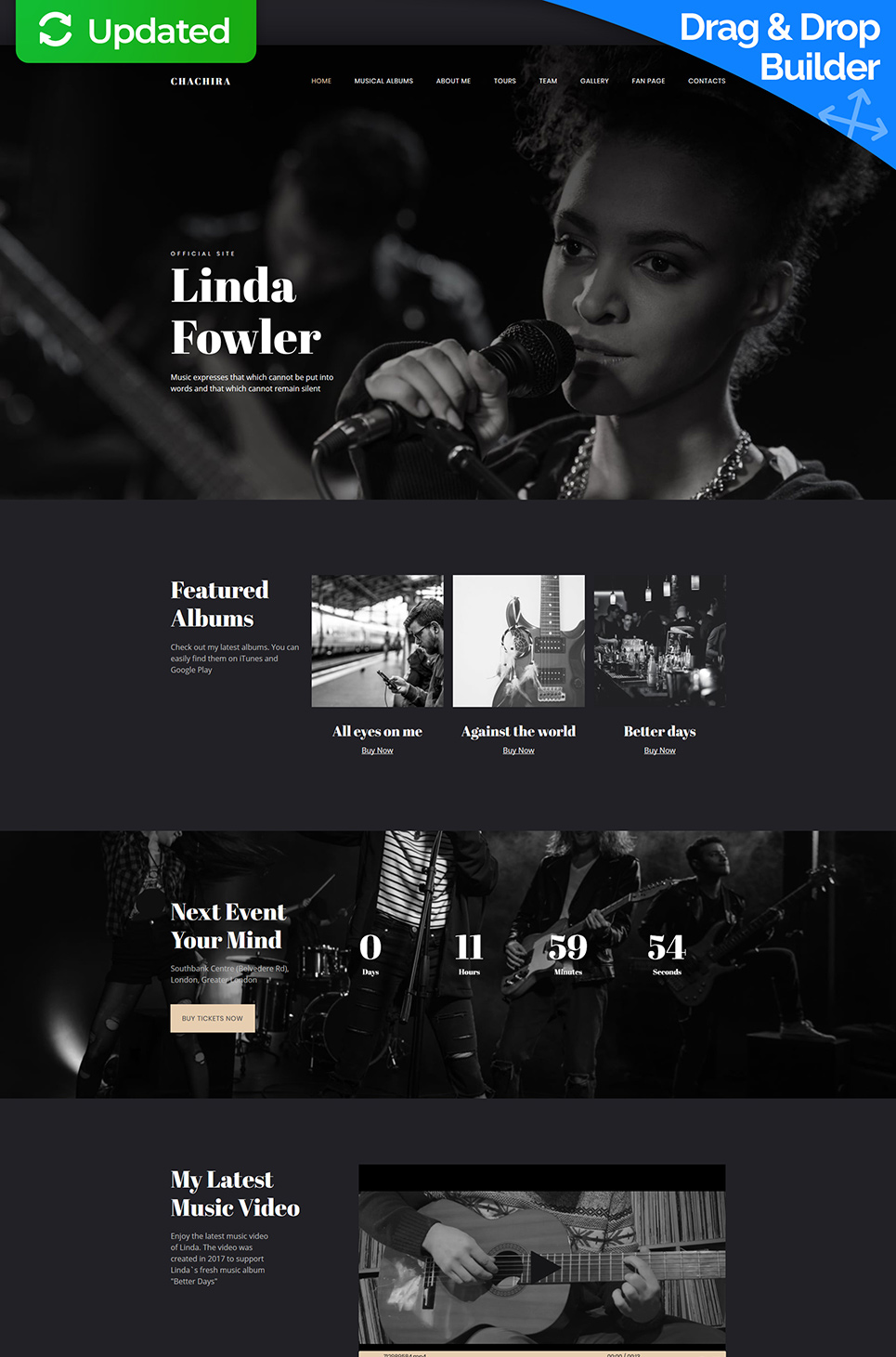 Chachira - хорошо подойдет для сайтов на тему Певец. Moto CMS 3 популярный шаблон - Singer Premium Moto CMS 3 Template.