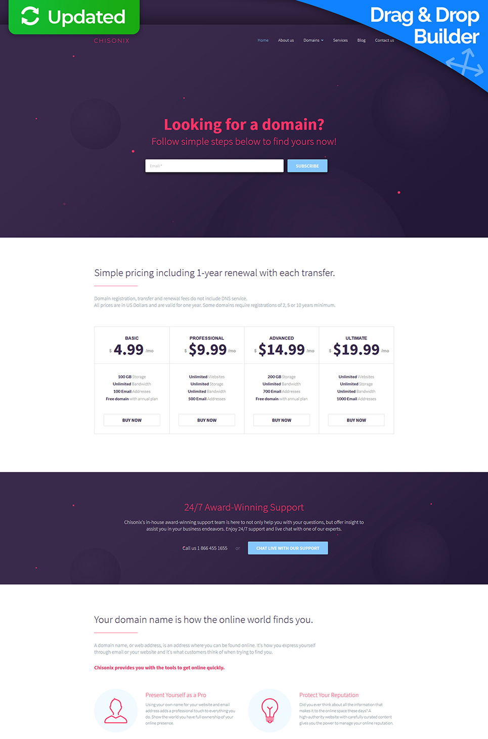 Chisonix - превосходно подходит для сайтов Доменный регистратор. Moto CMS 3 популярный шаблон - Internet Company Moto CMS 3 Template.