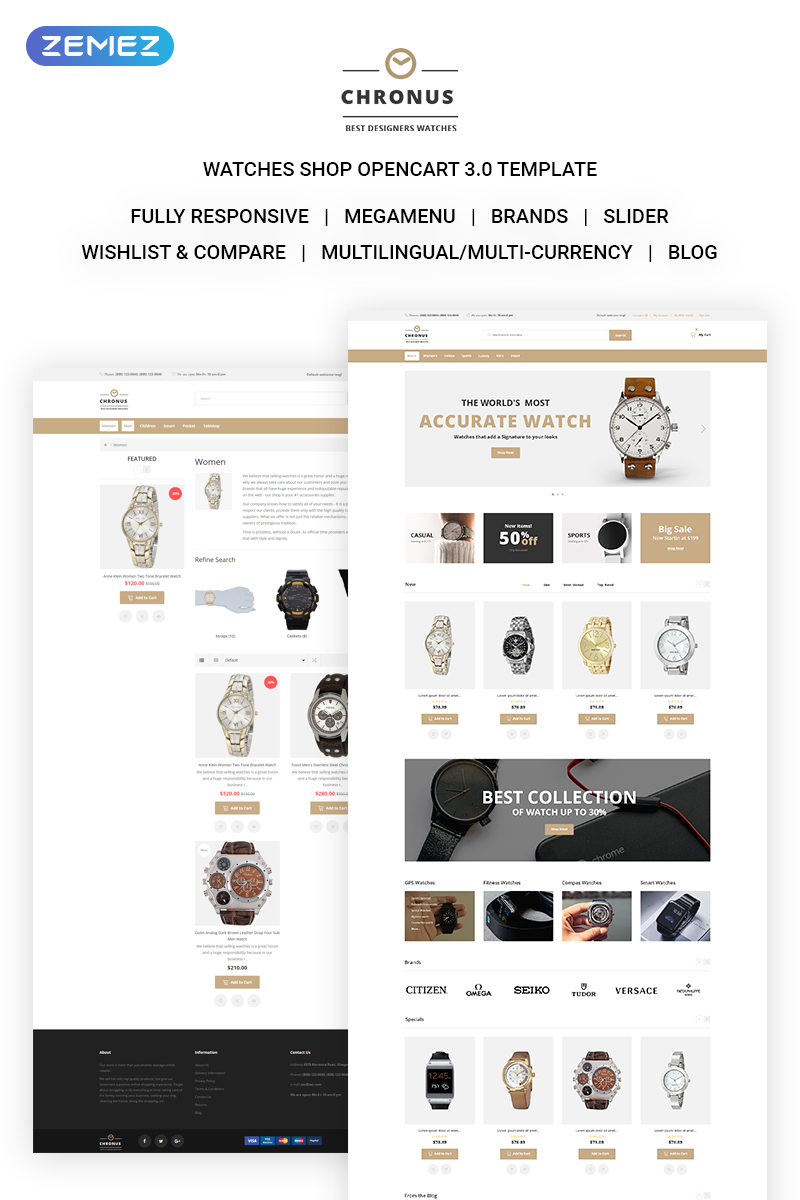 CHRONUS - превосходно подходит для сайтов в категории Часы. OpenCart шаблон для интернет-магазина - Watches Shop OpenCart Template.