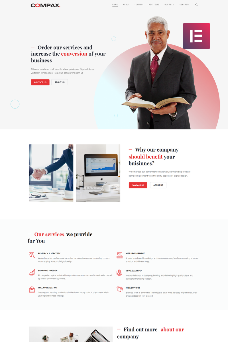 Compax - отлично подойдет для сайтов в области Бизнес услуги. WordPress шаблон 2021 года - Minimal Creative Business WordPress Elementor Theme.