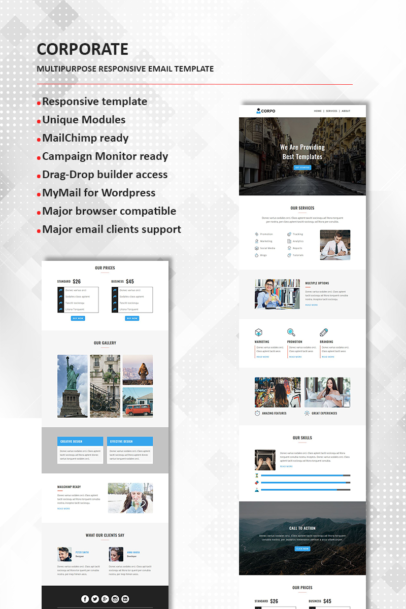 Corporate - идеально подойдет для сайтов в области Бизнес и услуги. Email шаблон почтовой рассылки - Multipurpose Responsive Newsletter Template.