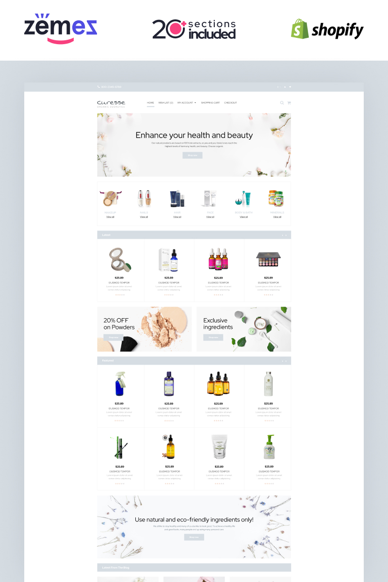 Curesse - отлично подойдет для сайтов в категории Магазин косметики. Shopify шаблон для интернет-магазина - Spa Cosmetics Store Shopify Theme.