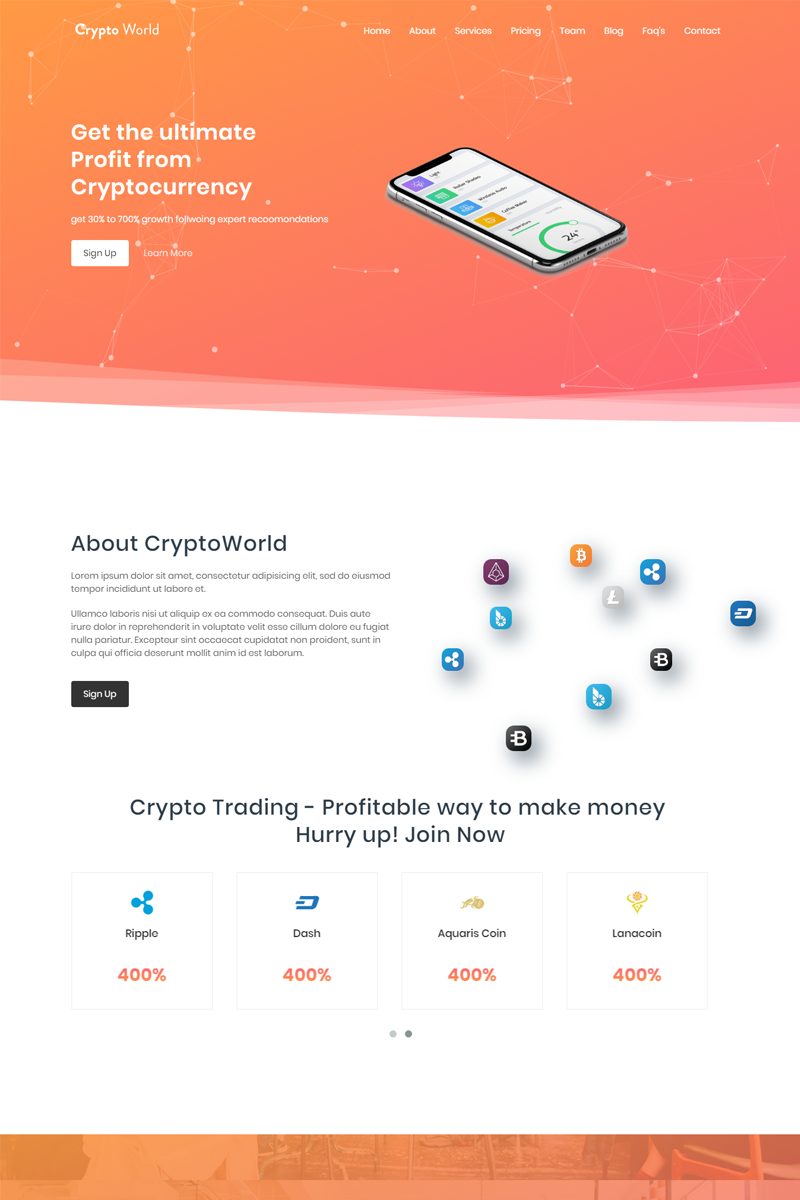 Лендинг шаблон одностраничника - CyrptoWorld - Bitcoin trading Landing Page Template, подходит для сайтов в категории Веб-дизайн.