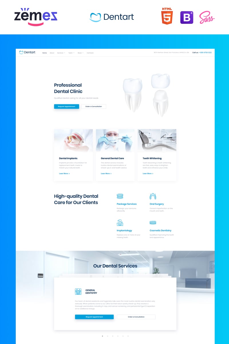 Dentart - отлично подойдет для сайтов в категории Стоматология. HTML5 мультишаблон для сайта - Dental Service Website Template.