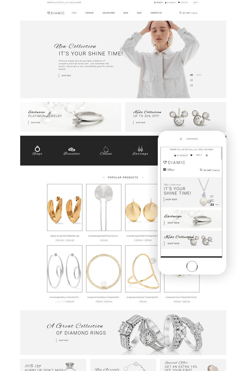 Diamic - идеально подойдет для сайтов в области Ювелирные украшения. Shopify интернет-магазин для сайта - Jewelry Multipage Clean Shopify Theme.