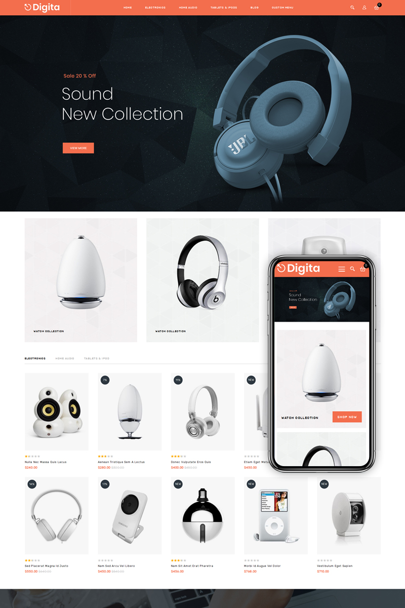 Digita - превосходно подойдет для сайтов на тему Электроника. Magento функциональный шаблон - Electronics Shop Magento Theme.