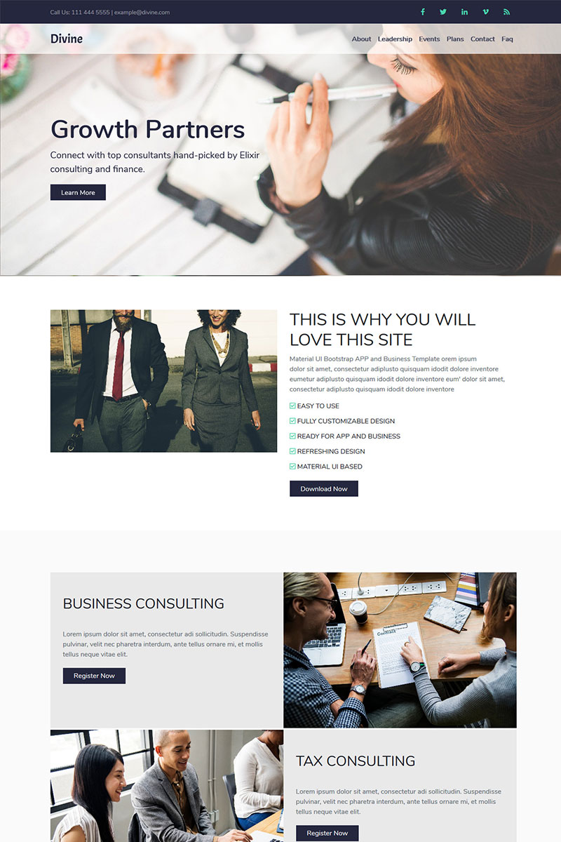 Лендинг шаблон посадочной страницы - Divine - Business Consulting HTML5 Landing Page Landing Page Template, специально для сайтов Консалтинг.