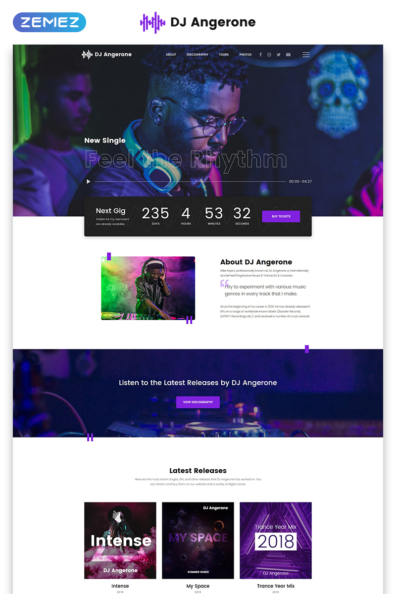HTML5 шаблон сайта - DJ Angerone - Music Multipage Modern HTML Website Template, специально для сайтов Диджей.