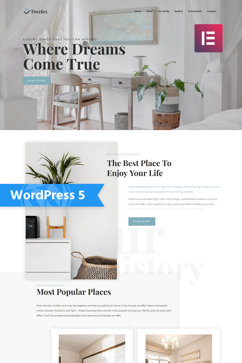 Dwelex - превосходно подойдет для сайтов Агентство недвижимости. WordPress продаваемый шаблон - Real Estate One Page Modern WordPress Elementor Theme.