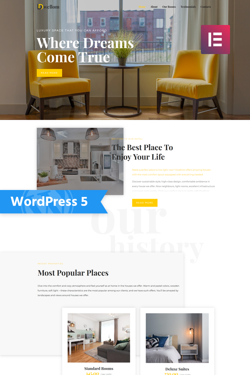 Dwellom - идеально подойдет для сайтов в категории Отели. WordPress шикарный шаблон - Hotel Clean WordPress Elementor Theme.