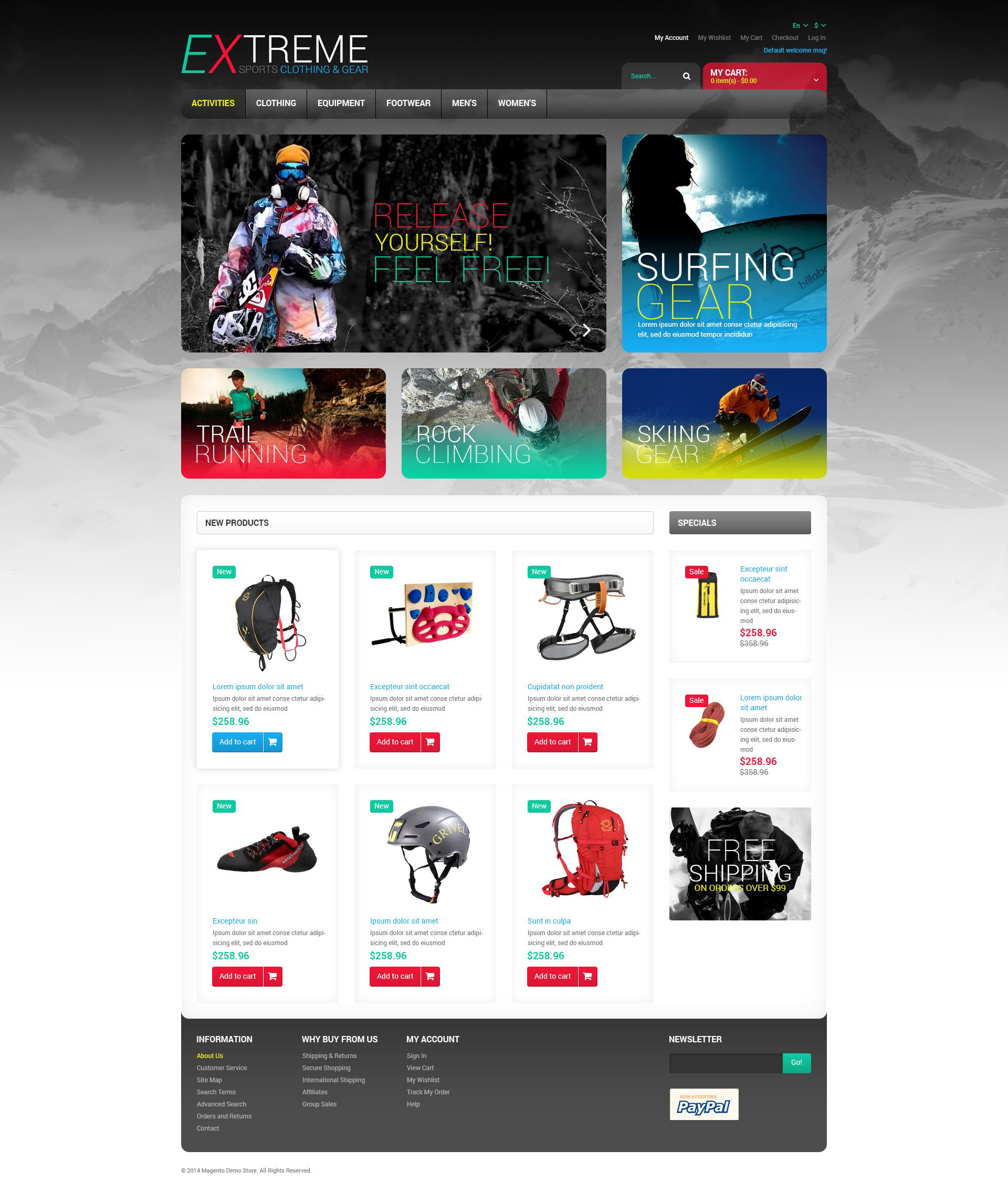 Magento минималистичный шаблон - Extreme Sports - Effective Online Store Magento Theme, идеально подойдет для сайтов в области Экстремальный спорт.