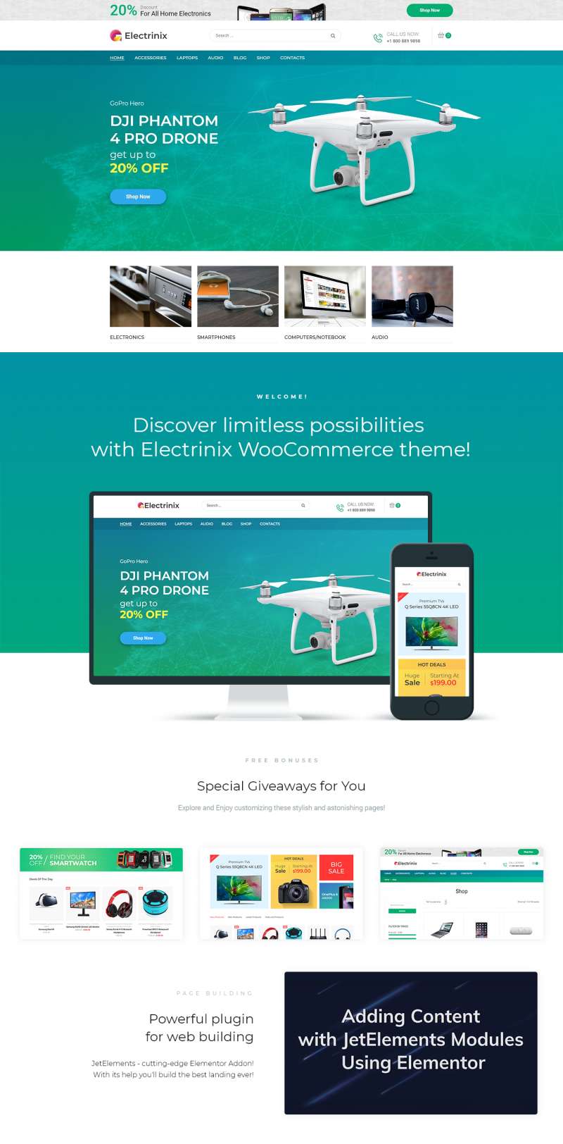 Electrinix - подойдет для сайтов в области Магазин DVD. WooCommerce онлайн-магазин Wordpress - Electronics Shop Elementor WooCommerce Theme.