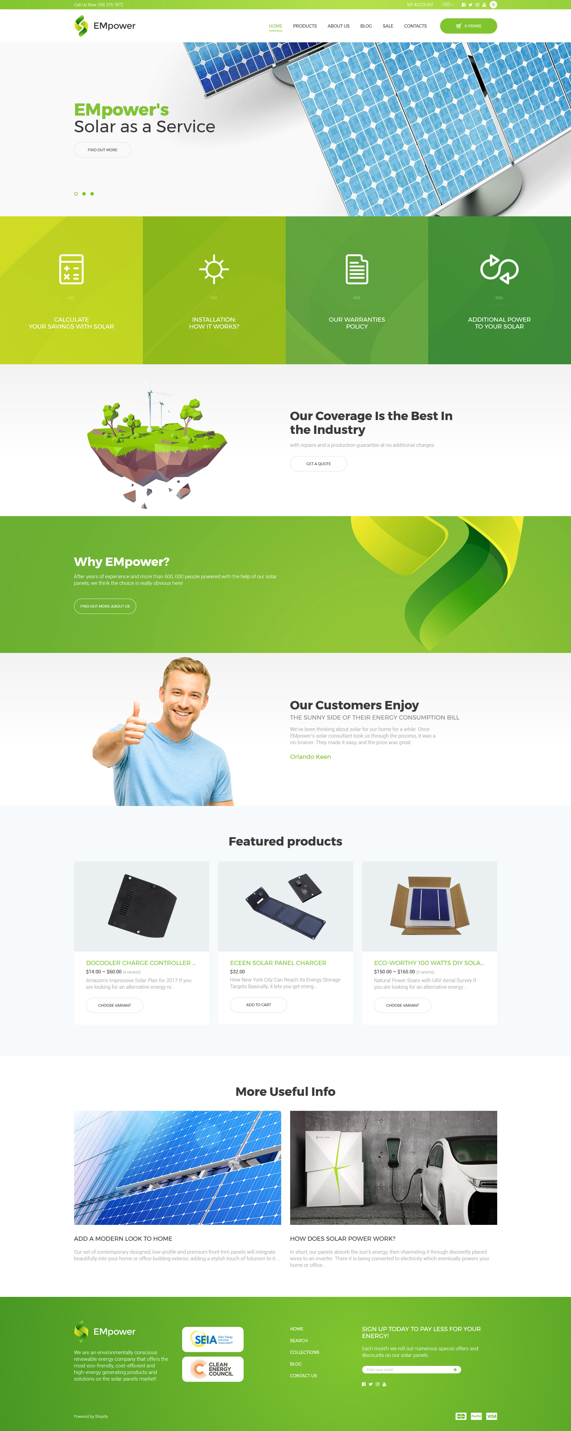 EMpower - превосходно подойдет для сайтов в сфере Солнечная энергия. Shopify интернет-магазин для сайта - Solar Energy Shopify Theme.