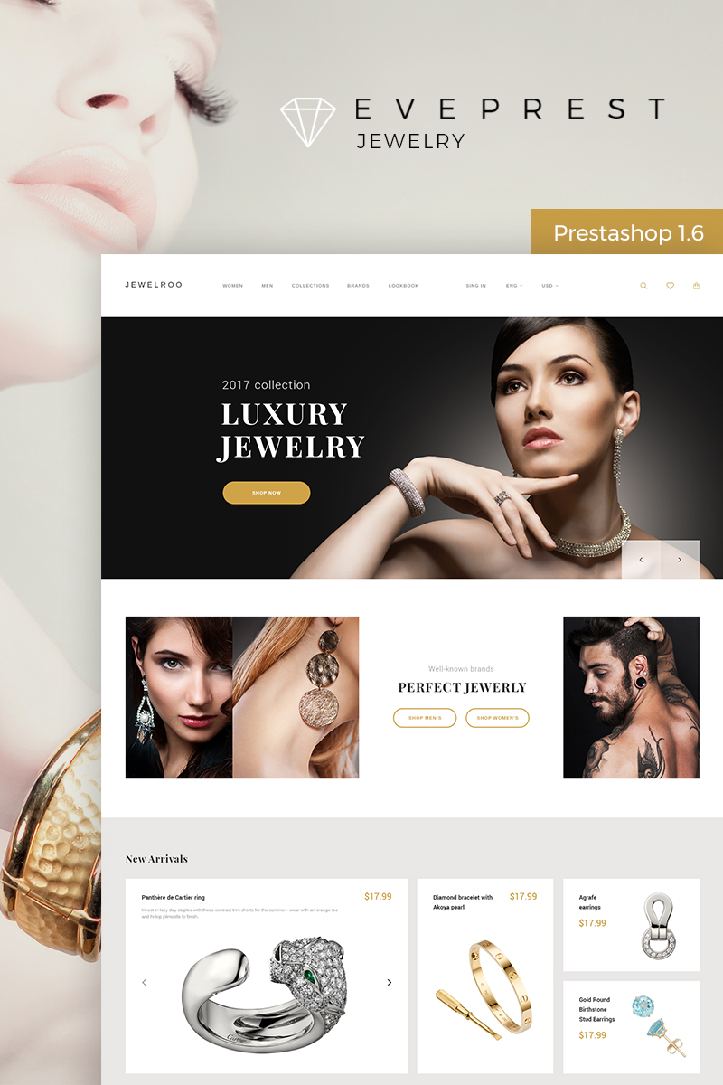 Eveprest - отлично подойдет для сайтов в категории Ювелирные украшения. PrestaShop шаблон для сайта интернет-магазина - Jewelry PrestaShop Theme.