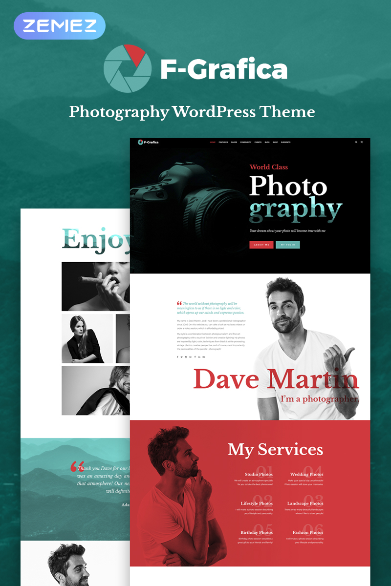 F-Grafica - идеально подходит для сайтов в области Портфолио фотографа. WordPress приятный шаблон - Photography WordPress Elementor Theme.