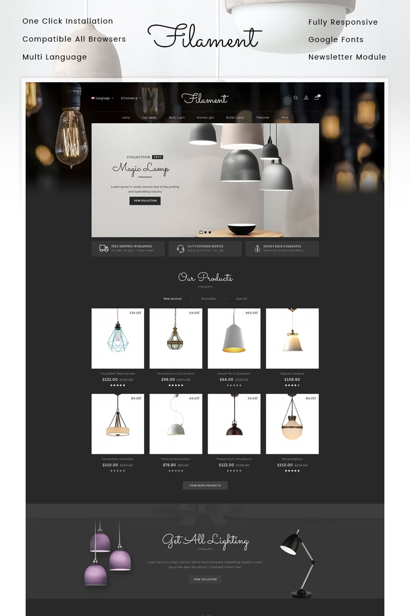 Interior Design - подходит для сайтов в сфере Дизайн интерьеров. OpenCart шаблон для интернет-магазина - Filament Lighting Store OpenCart Template.