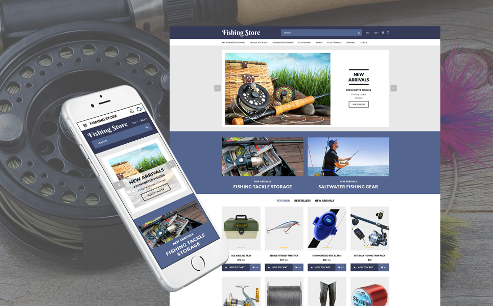 Fishing - хорошо подойдет для сайтов на тему Рыбалка. OpenCart интернет-магазин для сайта - Fishing Responsive OpenCart Template.