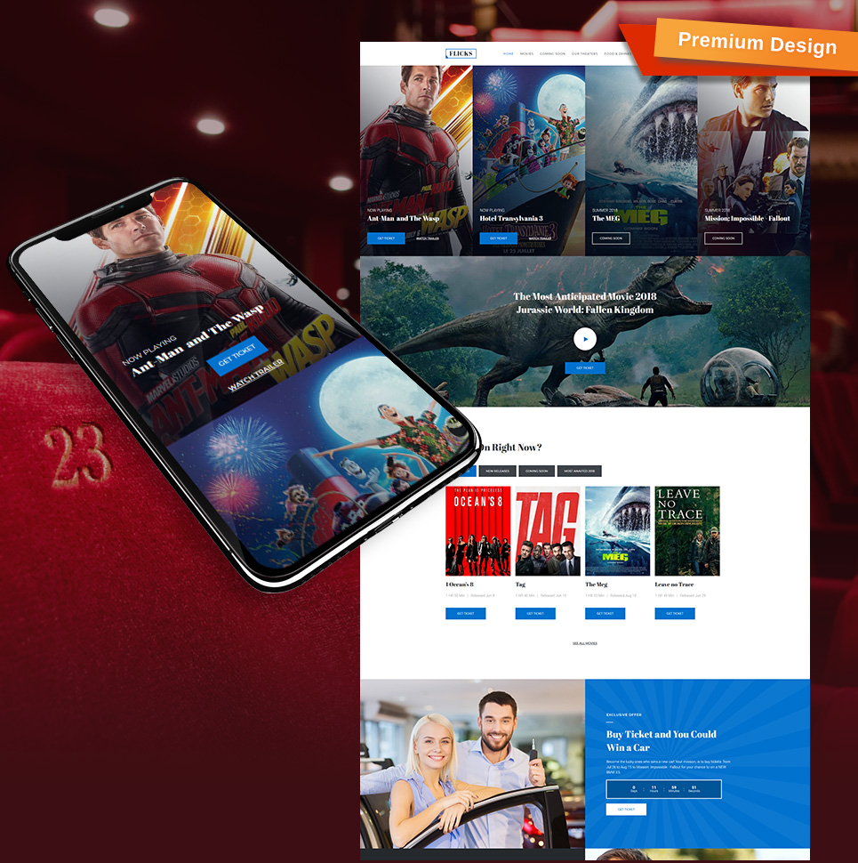 Flicks - отлично подходит для сайтов в области Кино. Moto CMS 3 минималистичный шаблон - Cinema Premium Moto CMS 3 Template.