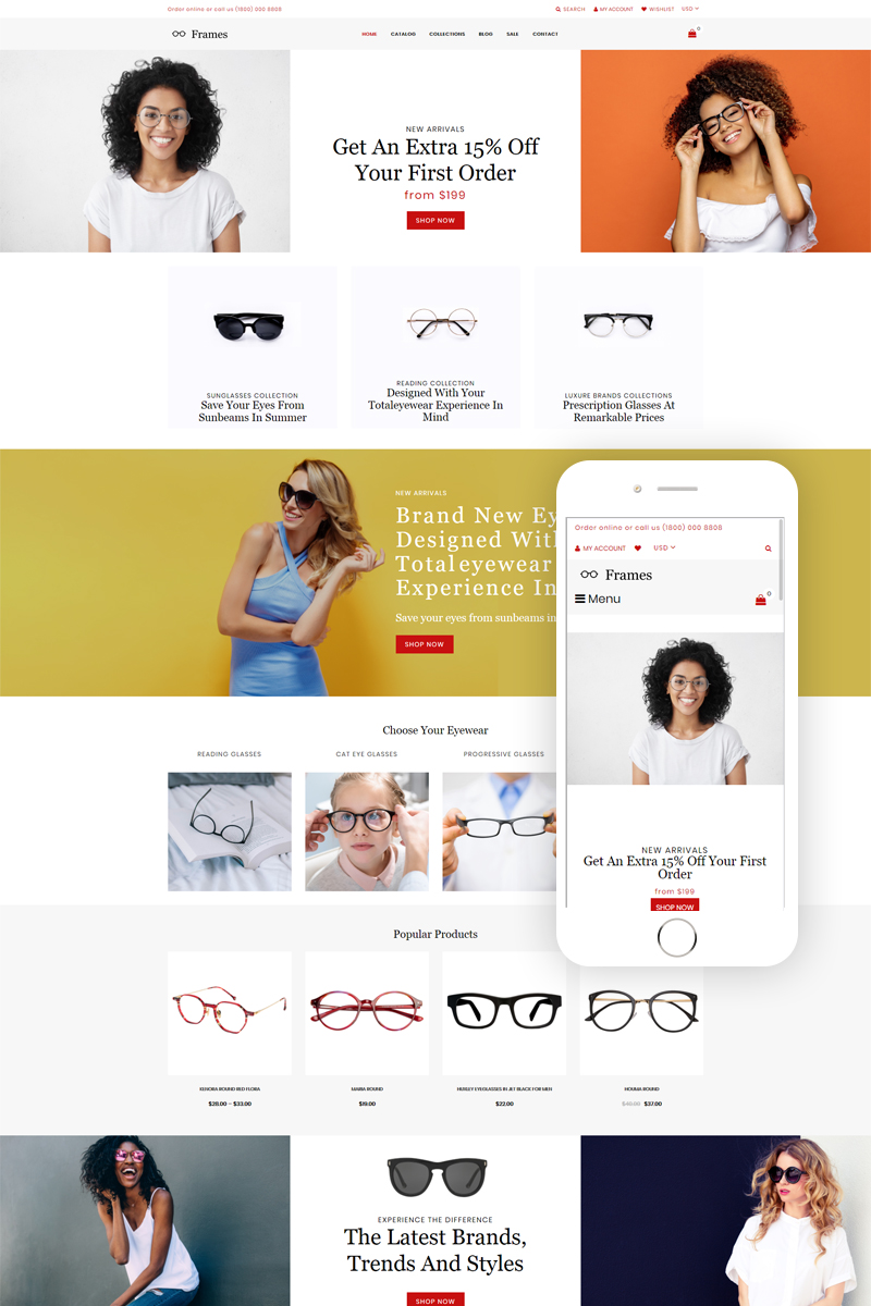 Frames - идеально подойдет для сайтов в категории Солнцезащитные очки. Shopify шаблон интернет-магазина - Glasses Store Clean Shopify Theme.