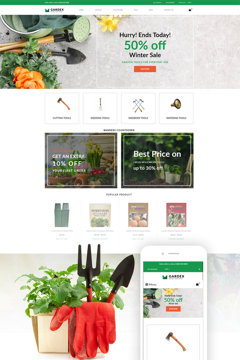 Gardex - отлично подойдет для сайтов в области Садовый дизайн. Shopify шаблон для сайта интернет-магазина - Gardening Clean Shopify Theme.