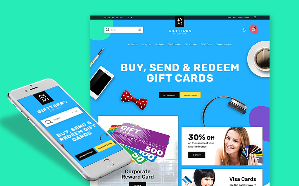 PrestaShop интернет-магазин для сайта - Giftterrs - Gift Cards for Any Purpose PrestaShop Theme, хорошо подойдет для сайтов на тему Подарки.