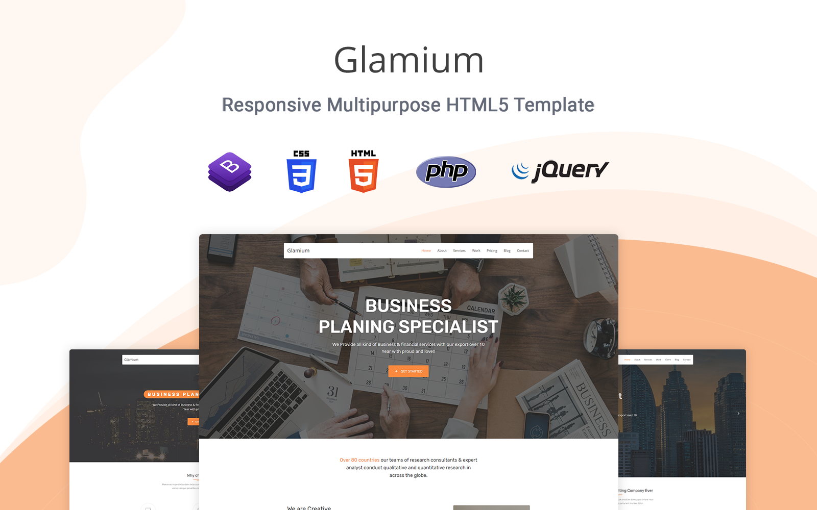 Glamium - хорошо подходит для сайтов в области Бизнес и услуги. Лендинг шаблон для одностраничного сайта - Responsive Landing Page Template.