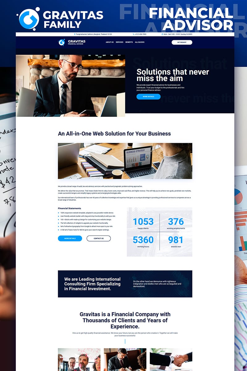Лендинг шаблон посадочной страницы - Gravitas - Financial Advisor MotoCMS 3 Landing Page Template, превосходно подходит для сайтов в области Финансовые консультации.