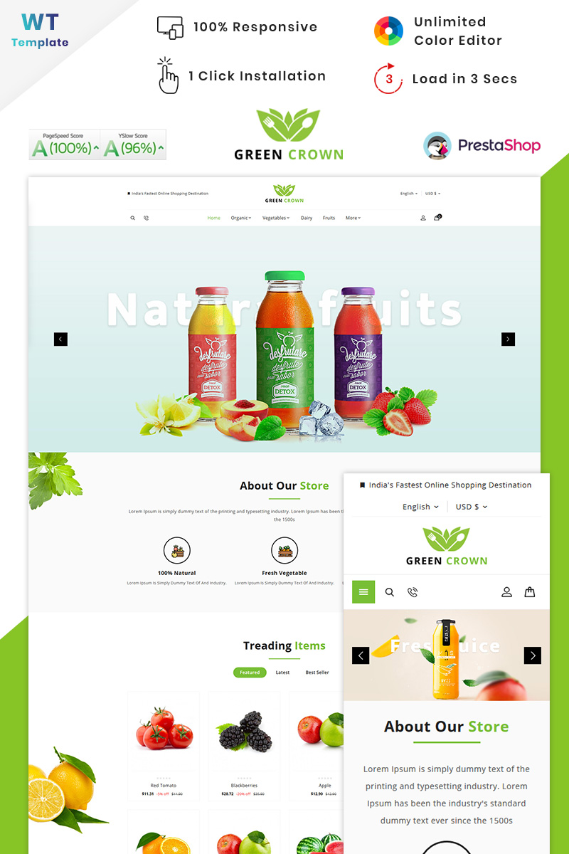 PrestaShop интернет-магазин - Green Crown Organic - Grocery PrestaShop Theme, превосходно подходит для сайтов в категории Электроника.