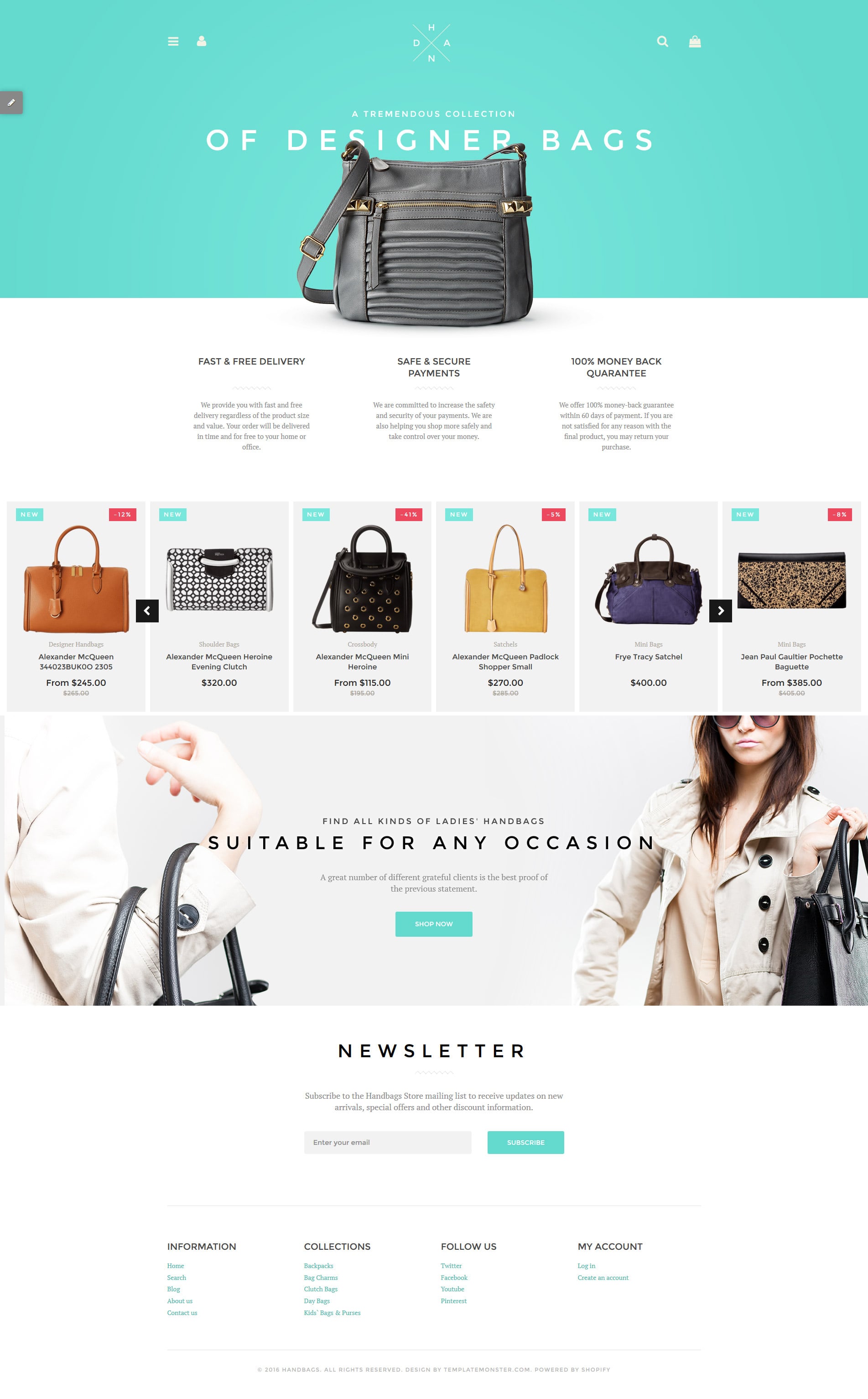 Handbag - превосходно подходит для сайтов в категории Магазин сумок. Shopify интернет-магазин для сайта - Handbag Boutique Shopify Theme.