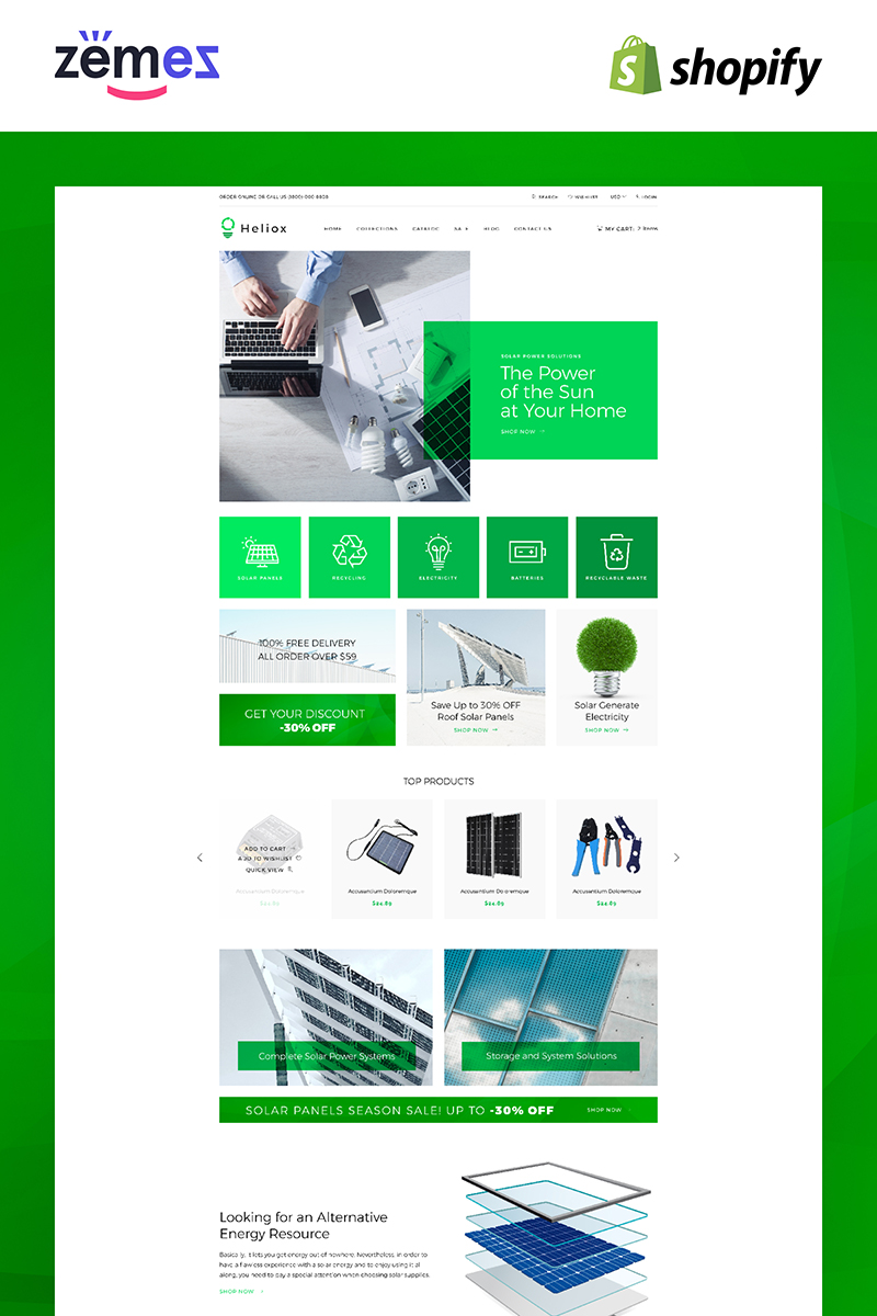 Helios - подходит для сайтов в сфере Солнечная энергия. Shopify шаблон для сайта интернет-магазина - Solar Energy eCommerce Modern Shopify Theme.