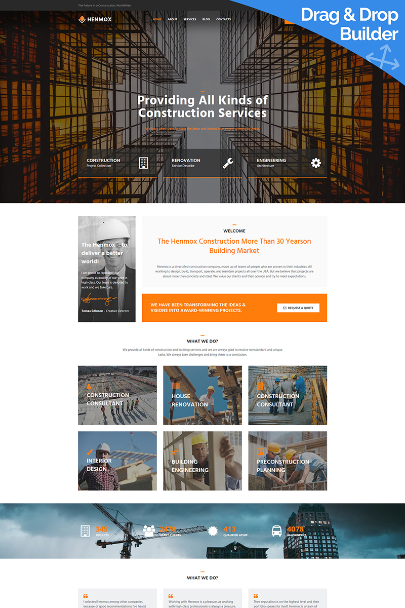 Moto CMS 3 профессиональный шаблон - Henmox - Construction Company Moto CMS 3 Template, подойдет для сайтов Строительные компании.