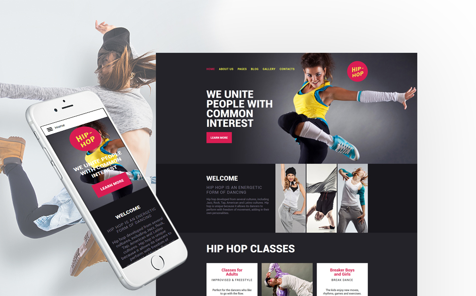 Joomla универсальный шаблон - Hip-Hop - Dance Studio Responsive Joomla Template, подойдет для сайтов в области Танцевальная студия.