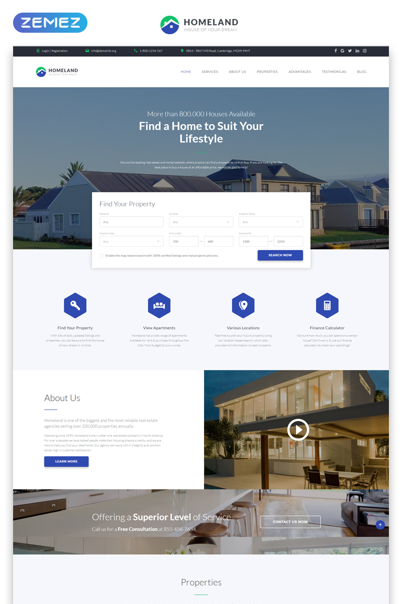 Лендинг шаблон для одностраничного сайта - Homeland - Real Estate Agency Classic Bootstrap4 HTML Landing Page Template, идеально подходит для сайтов в категории Агентство недвижимости.