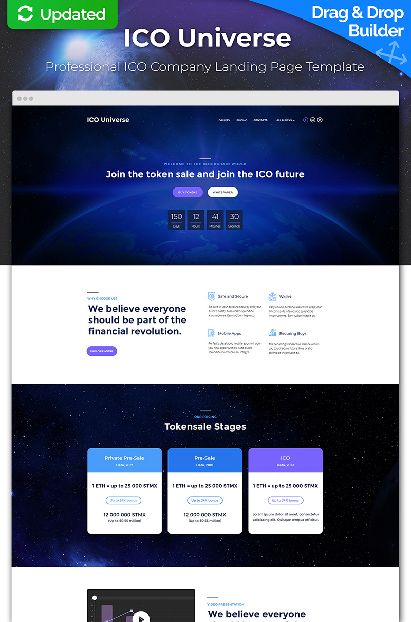 Лендинг шаблон для одностраничного сайта - ICO Universe - Bitcoin Cryptocurrency MotoCMS 3 Landing Page Template, хорошо подойдет для сайтов Консалтинг.