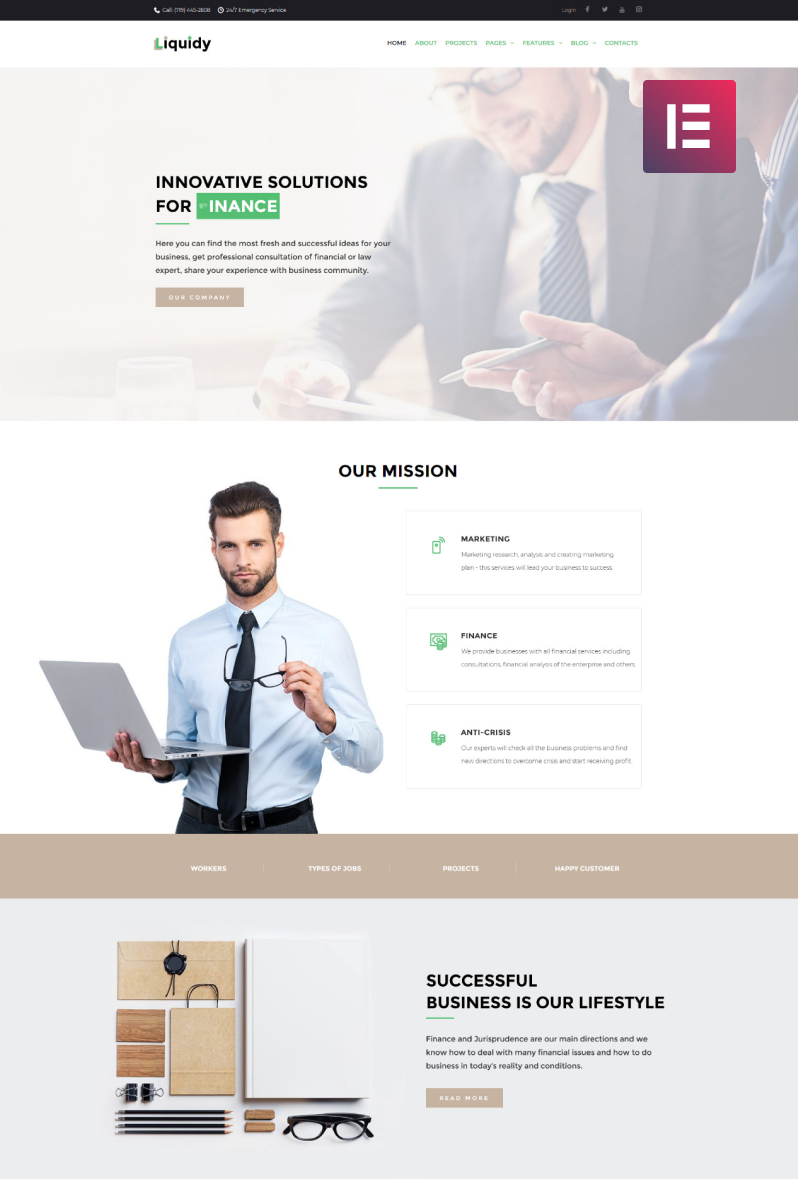 WordPress профессиональный шаблон - Liquidy - Investment Company WordPress Elementor Theme, превосходно подойдет для сайтов в категории Бизнес услуги.
