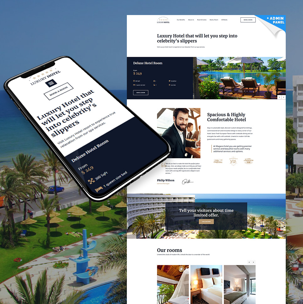 Hotels - отлично подходит для сайтов в категории Отели. Лендинг шаблон одностраничного сайта - Luxury Hotel Landing Page Template.