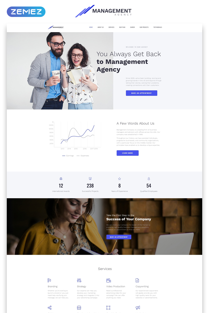 Management - хорошо подойдет для сайтов в сфере Консалтинг. Лендинг шаблон одностраничного сайта - Brilliant Management Company HTML Landing Page Template.
