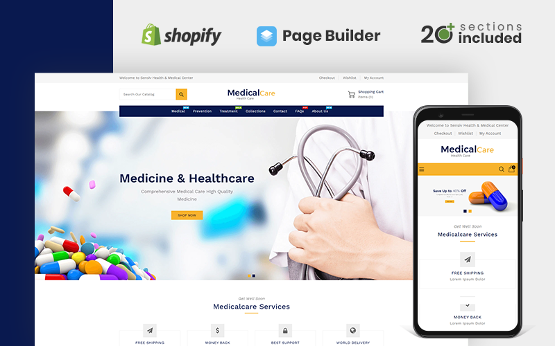 Shopify шаблон для сайта интернет-магазина - Drug Store - Medical Care Health&Medicine Store Shopify Theme, превосходно подходит для сайтов на тему Аптека.