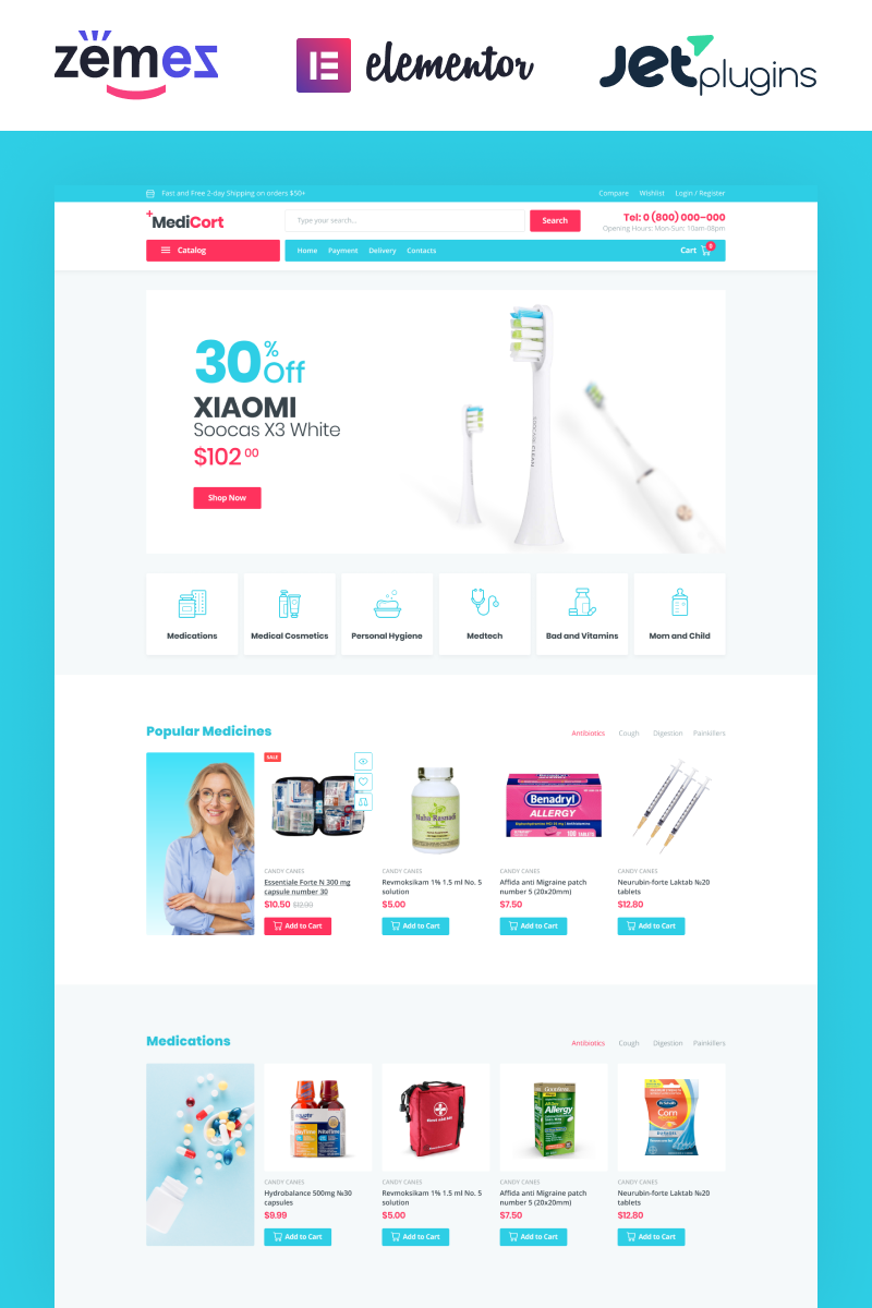 WooCommerce шаблон для интернет-магазина на Wordpress - MediCort - Medical ECommerce Classic Elementor WooCommerce Theme, превосходно подойдет для сайтов в сфере Медицина.