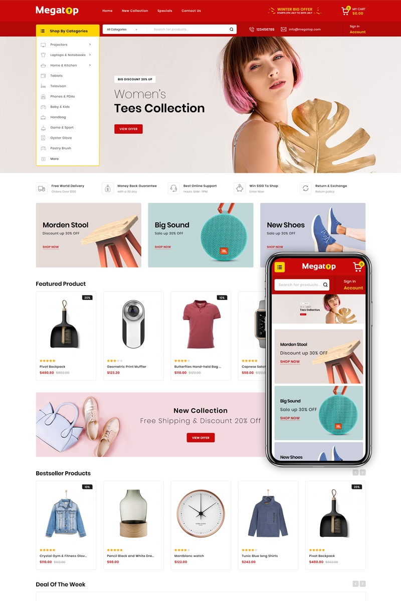 Megatop - отлично подходит для сайтов в области Электроника. OpenCart шаблон интернет-магазина - Multipurpose OpenCart Template.