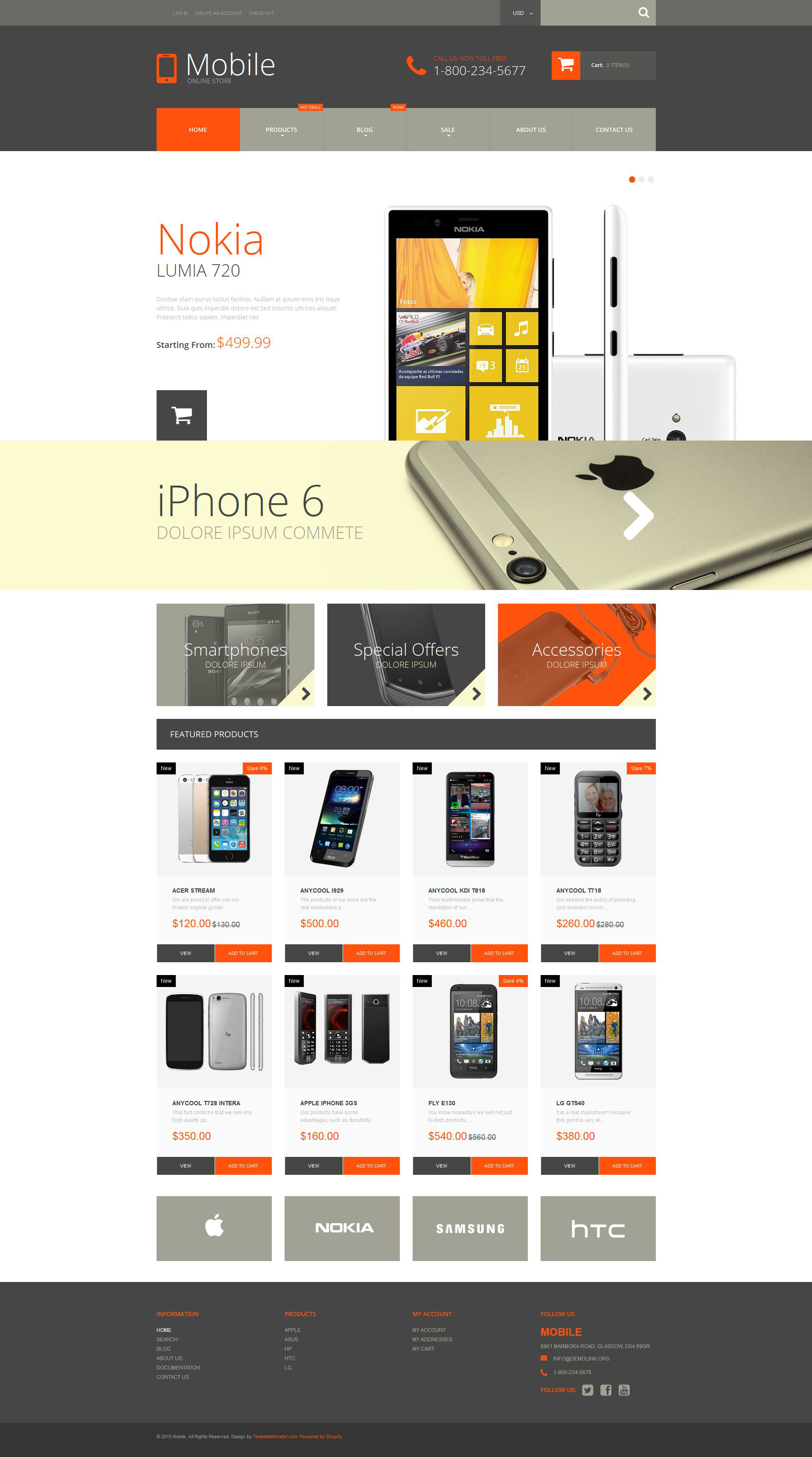 Shopify шаблон для сайта интернет-магазина - Mobile Store - Mobile Phones Shopify Theme, превосходно подходит для сайтов на тему Магазин мобильной связи.